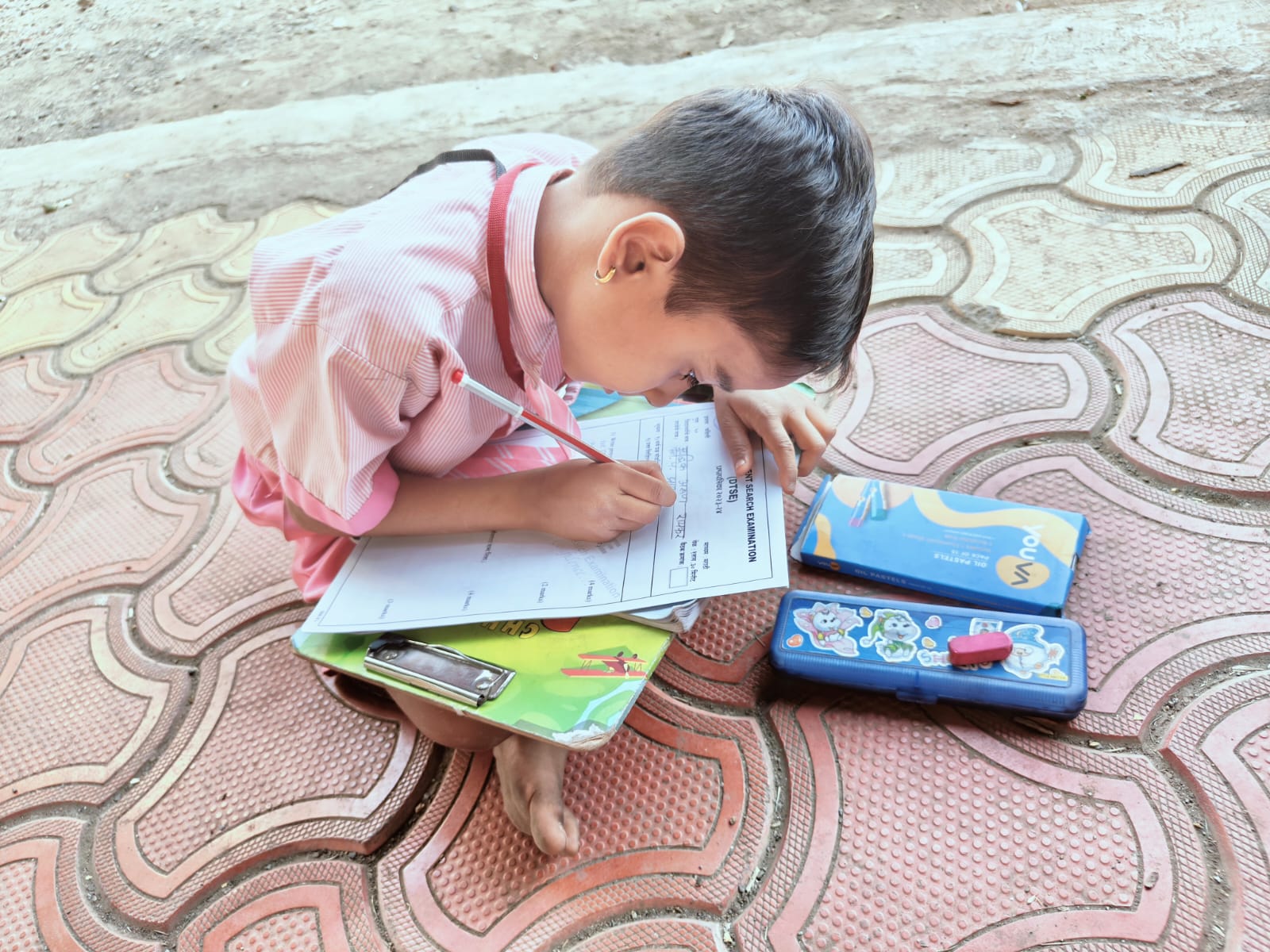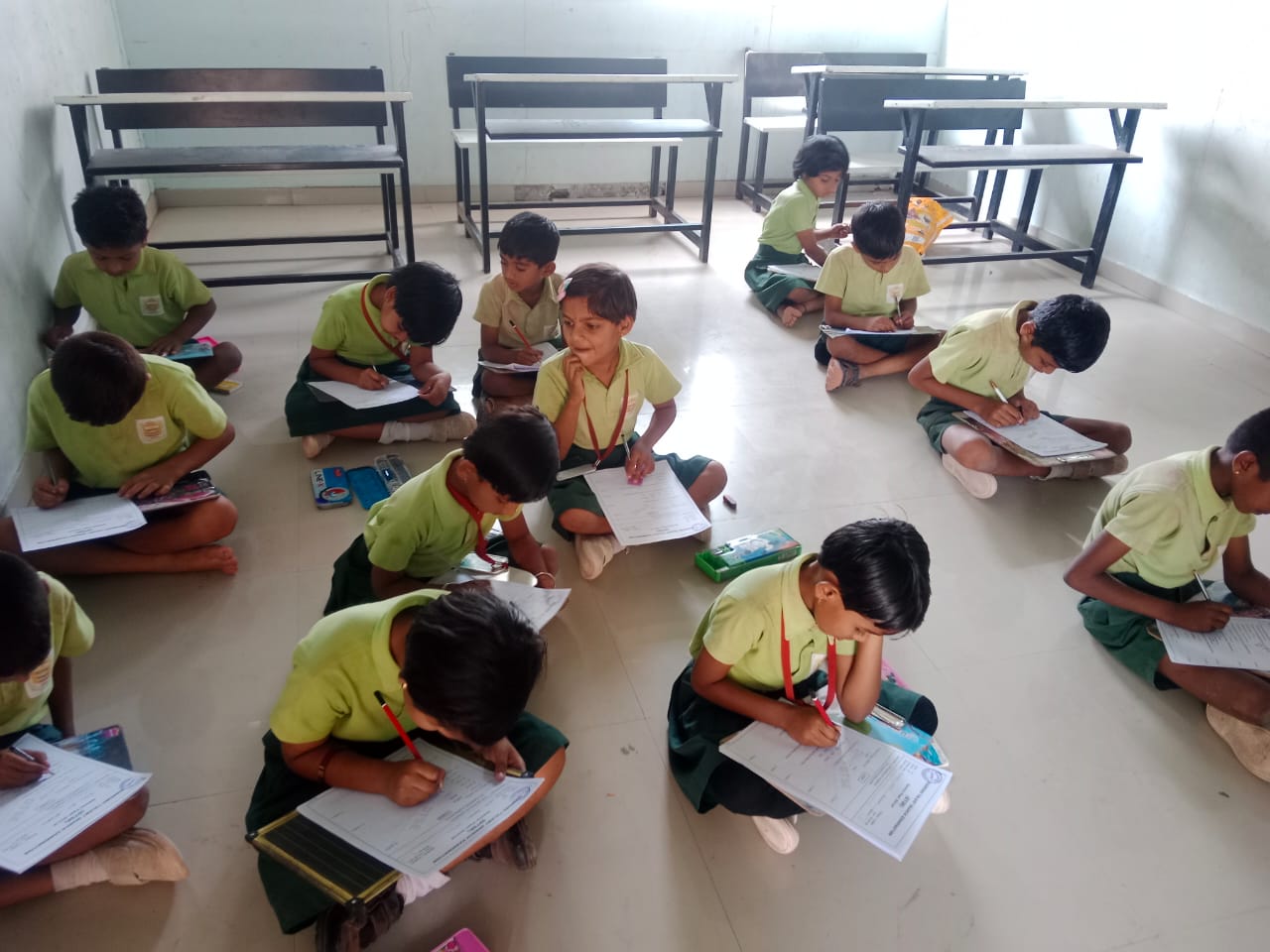 भाषा, गणित, इंग्रजी या विषयांचे एकत्रीत ४५ प्रश्न ९० गुणांसाठी, मराठी निबंध ५ गुण व इंग्रजी निबंध ५ गुण अशी एकूण १०० गुणांची (ई ३ री ते ई ८ वी ) परीक्षा घेतली जाते. नर्सरी ते 2 री ५० गुणांची परीक्षा घेतली जाते. (१५ प्रश्न ३० गुण व २० गुण चित्रकला )